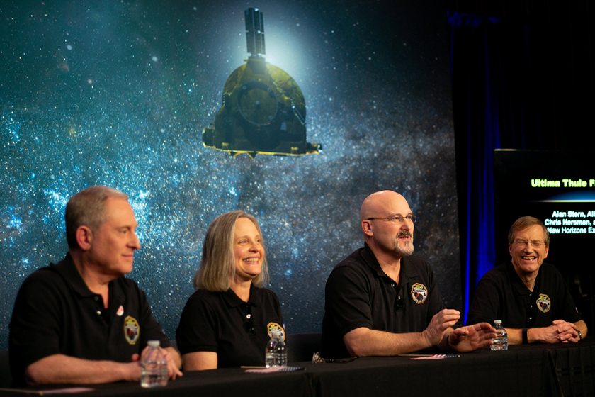 当地时间2019年1月1日,美国马里兰州,“新视野”号探测器研究人员出席新闻发布会。据美国宇航局(NASA)官网消息,当地时间1月1日上午,NASA收到了来自“新视野”号探测器的信息,确认其成功近距离飞掠遥远天体“天涯海角”(Ultima Thule)。图/视觉中国