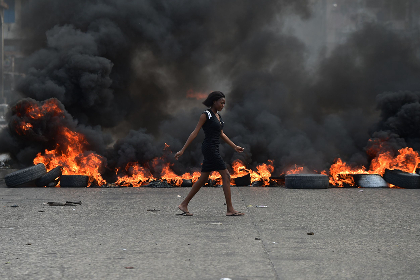 当地时间2019年2月10日,海地太子港,抗议活动进入第四天,街头浓烟滚滚。海地民众示威抗议海地政府从海地-委内瑞拉的Petrocaribe基金会窃取巨额资金,并要求海地总统莫伊兹辞职。图/视觉中国