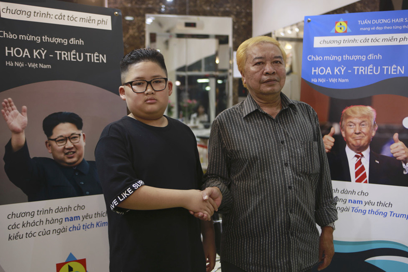 当地时间2019年2月19日,越南河内,9岁的To Gia Huy与66岁的Le Phuc Hai理发后合照。美国总统特朗普与朝鲜最高领导人金正恩将于2月27至28日在越南河内举行第二次峰会。越南河内一家理发店决定搭“特金会”热潮,推出“免费理特朗普和金正恩发型”的活动。图/东方IC