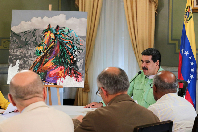 当地时间2019年2月21日,委内瑞拉加拉加斯,委内瑞拉总统马杜罗出席会议。马杜罗当天下午在与军方高层的会议中宣布,自当地时间21日晚8时起关闭委内瑞拉与巴西的边界。图/视觉中国