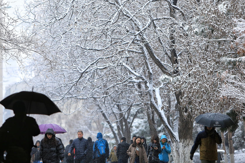 2019年3月21日,沈阳,当日正值春分节气,三月飞雪迎来倒春寒,市区内的上班族在雪中赶路。图/视觉中国