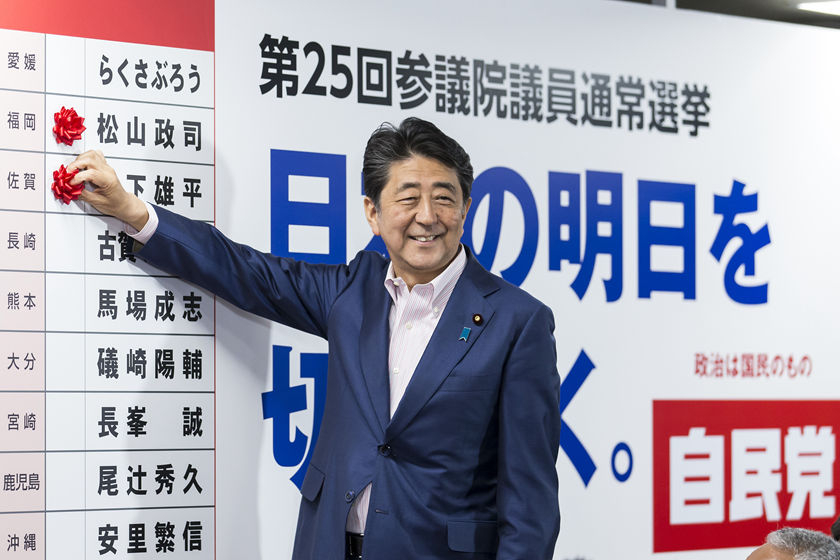 当地时间2019年7月21日,日本东京,日本执政党自民党(LDP)总部,自民党主席安倍晋三为自民党候选人的名字贴上小红花,表明该成员在选举中获胜。日本第25届参议院选举最终结果于22日凌晨4时全部揭晓,自民党获得57个议席,公明党获得14个议席,加上未改选的70个议席,由自民党和公明党组成的执政联盟在参议院共有141个议席,超过半数。最大在野党立宪民主党势头强劲,获得17个改选议席,增长了近一倍。图/视觉中国