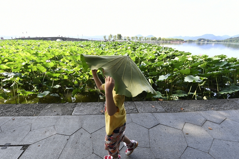 2019年7月25日,杭州,一名儿童头顶一片荷叶从西湖边走过。每年盛夏时节,西湖水域管理处荷花班的养护员每天都会采收部分荷叶和莲蓬,定时定点定量地供应给市民。图/视觉中国