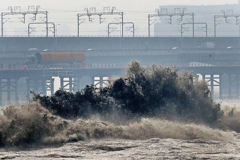 2019年8月18日,农历七月十八,杭州,钱塘江潮水从江面涌过,潮头拍岸溅起。每年农历七月是钱塘江大潮的望汛大潮,有的年份潮水甚至高过当年的八月十八的大潮汛,十分凶险,因而在民间俗称其为“鬼王潮”。图/视觉中国