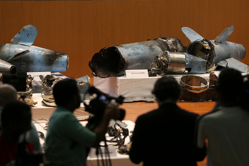 当地时间2019年9月18日,沙特利雅得,在记者会上,沙特方面向外界展示了在袭击现场收集的导弹和无人机残骸。美国总统特朗普18日在推特上称,已指示财政部长大幅增加对伊朗的制裁。图/视觉中国