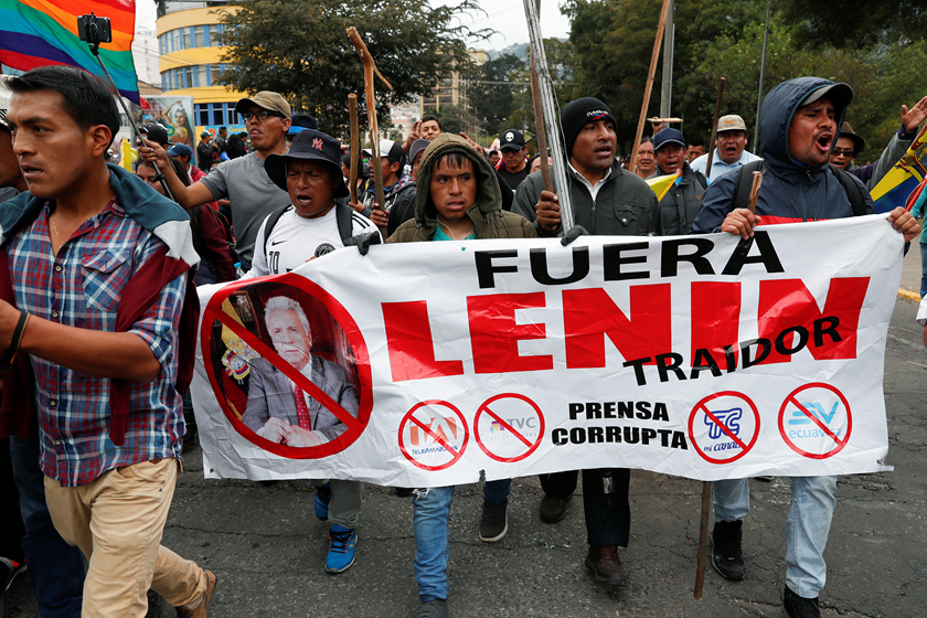 当地时间2019年10月8日,厄瓜多尔基多,示威者手举横幅游行。日前,厄宣布取消对汽油等燃油的价格补贴,这一措施导致油价大涨并引发民众强烈不满。为抗议政府放开汽油价格,厄交通运输业者3日举行全国大罢工。厄瓜多尔总统莫雷诺3日宣布全国进入为期60天的紧急状态,以应对厄公共交通行业宣布罢工给社会造成的混乱状况。莫雷诺7日宣布,鉴于当前首都基多的安全局势愈发紧张,厄政府机关将从基多临时迁至厄瓜多尔第一大城市瓜亚基尔。图/视觉中国