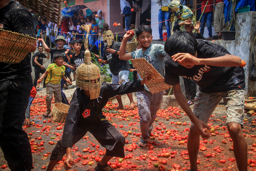 当地时间2019年10月13日,印尼西爪哇省伦邦,当地举行“番茄大战”。为解决富余的番茄,当地有举办番茄大战的传统,比赛后,所有作为“子弹”扔出的番茄都被再次收集起来,用作堆肥材料和蔬菜肥料。图/视觉中国