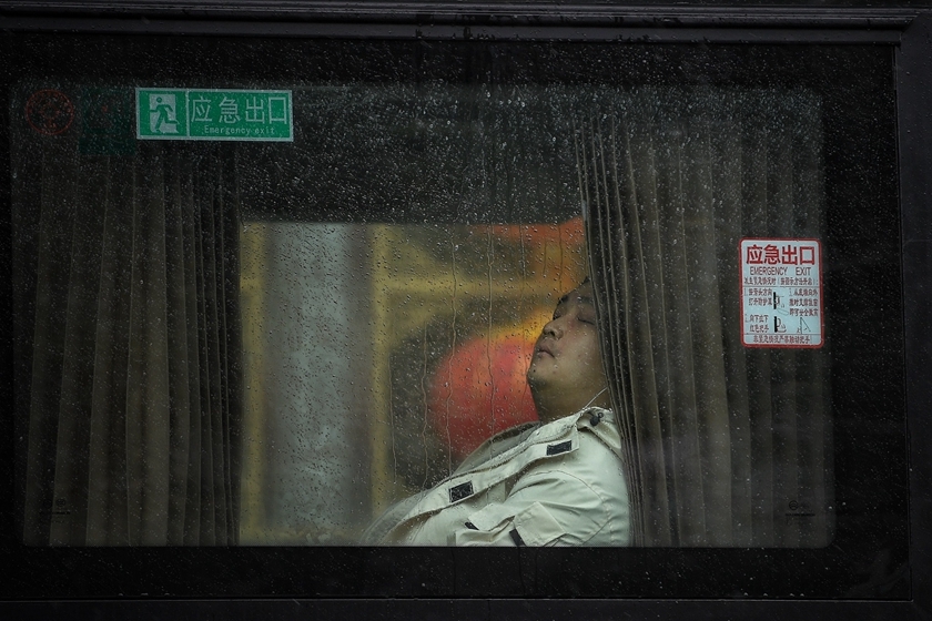 2019年10月4日,北京,窗外在下雨,一名男子在睡觉。受较强冷空气影响,多地气温下降。图/视觉中国