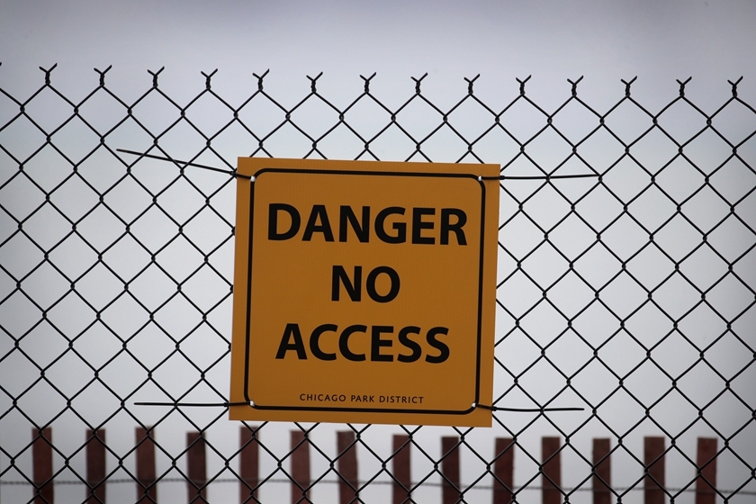 当地时间2019年11月18日,美国芝加哥,密歇根湖水位持续偏高,一块禁入标志的牌子。密歇根湖附近一条人行道和防波堤被冲垮。图/视觉中国
