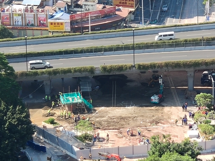 2019年12月2日下午,广东广州地面塌陷事故现场,塌陷路面已经填平。救援人员在塌陷区域安装了钢护筒,形成救援通道,向地下深挖,搜寻3名被困人员。 图/财新记者 方祖望