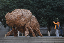 2019年12月10日,浙江杭州,一位市民在观看由落叶搭建的艺术品。近日,中国美术学院举行秋叶艺术节,多个以树木落叶搭建的艺术装置亮相浙江杭州西湖边,成为一道独特的风景。图/中新社