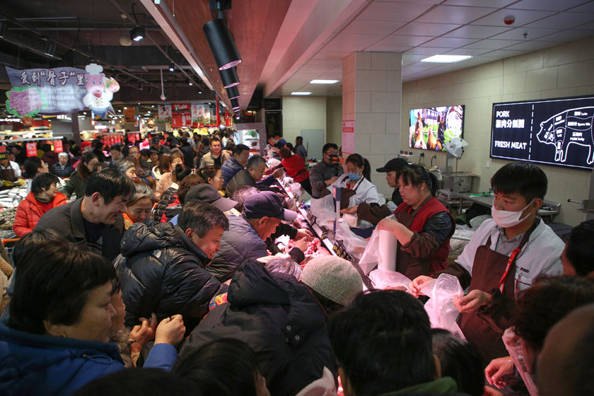 2019年12月19日,山东省滨州市,当地一家新开业超市举办促销活动,特价猪肉吸引了大批市民前来抢购,柜台前被挤得水泄不通。据了解,此次促销动用的冷藏猪肉超过了3吨。