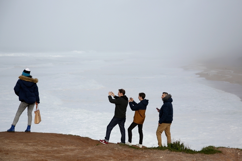 葡萄牙海岸掀巨浪 民众踏浪而行