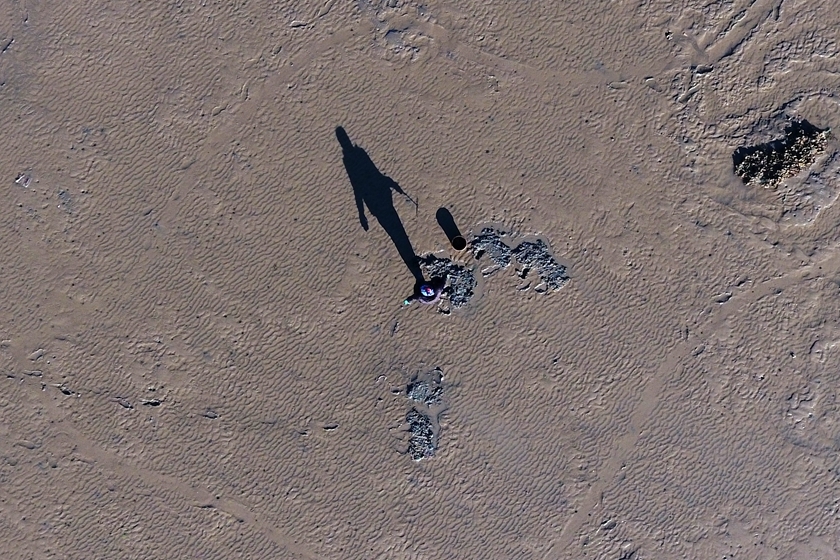 2020年1月13日,天津,渔民在滩涂拾贝。