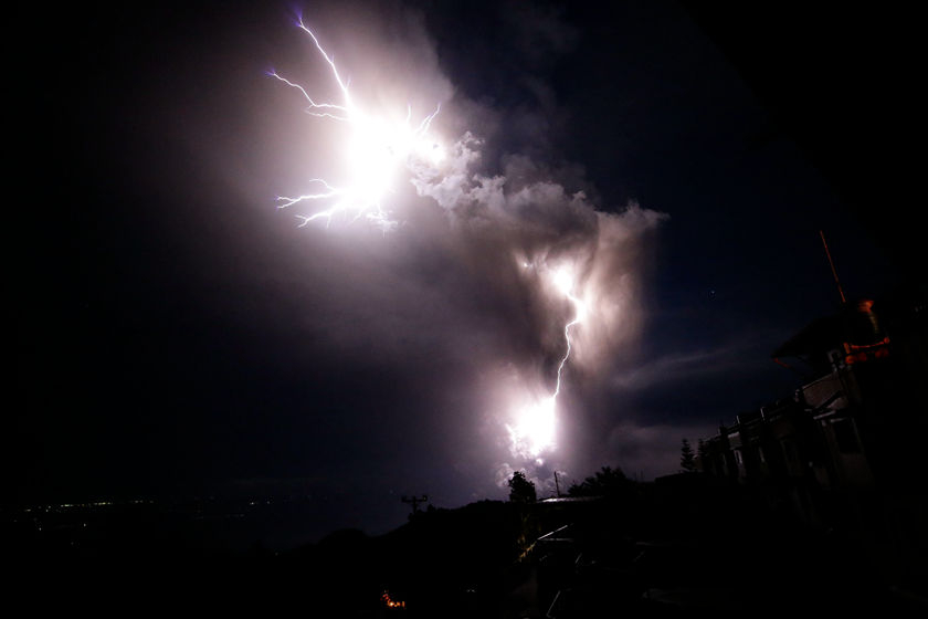 当地时间2020年1月12日,菲律宾塔尔火山喷发,火山灰直冲云霄。天空出现耀眼闪电,闪电在火山灰中“穿梭”。