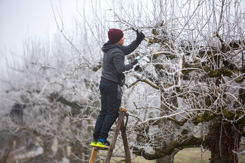 当地时间2020年1月14日,匈牙利Galambok,一名工人在修剪一棵覆盖着白霜的梨树。
