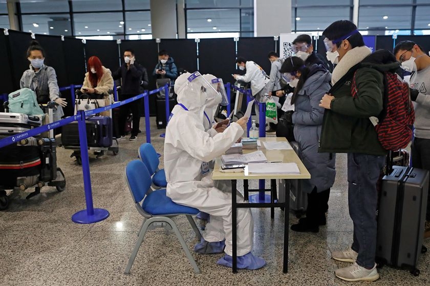 2020年3月29日,在浦东机场T2航站楼内,浦东机场交通保障人员正对在上海集中隔离的入境人员进行信息核查。图/殷立勤/中新社/人民视觉