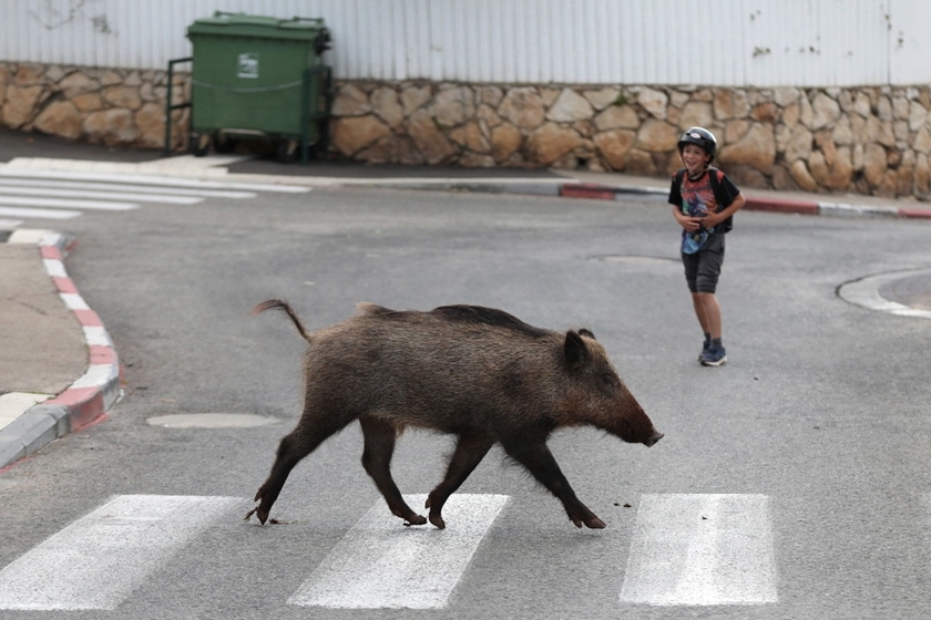 当地时间2020年4月11日,以色列海法,民众宅家期间,野猪在街道过马路。图/IC photo