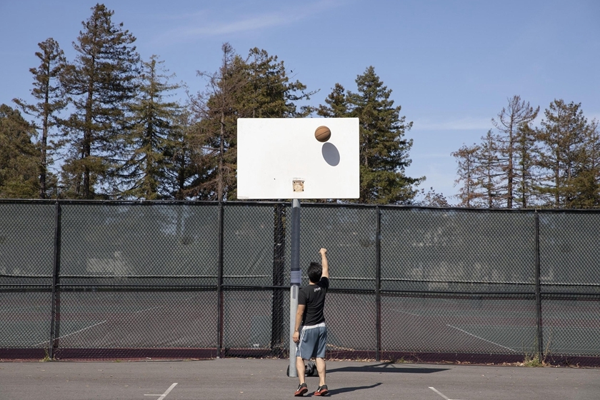当地时间2020年5月7日,美国加州旧金山,一位篮球爱好者在篮球场打篮球。为阻止人们在新冠肺炎爆发期间聚众打篮球,这所学校拆除了校园内所有篮球框。图/人民视觉