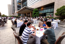 2020年5月19日,湖北武汉,夜幕还未降临,在汉口泛海喜来登酒店大门外的广场上,摆满餐桌开起夜间大排档,吸引了不少市民前来消费。