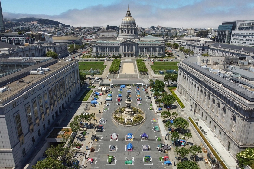 旧金山市政厅前建无家可归者营地 画方框确保距离