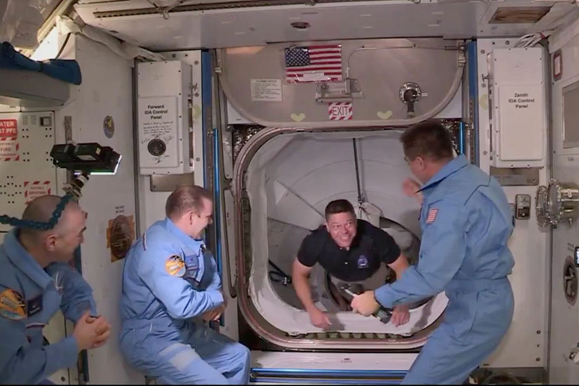 美东时间5月31日10时16分(北京时间5月31日22时16分),载有两名美国宇航员的美国太空探索技术公司“龙”飞船在经过约19小时飞行后,于31日飞抵国际空间站,并与之顺利对接。几个小时后,“龙”飞船上的宇航员进入空间站,国际空间站上的宇航员与“龙”飞船上的宇航员相聚(视频截图)。