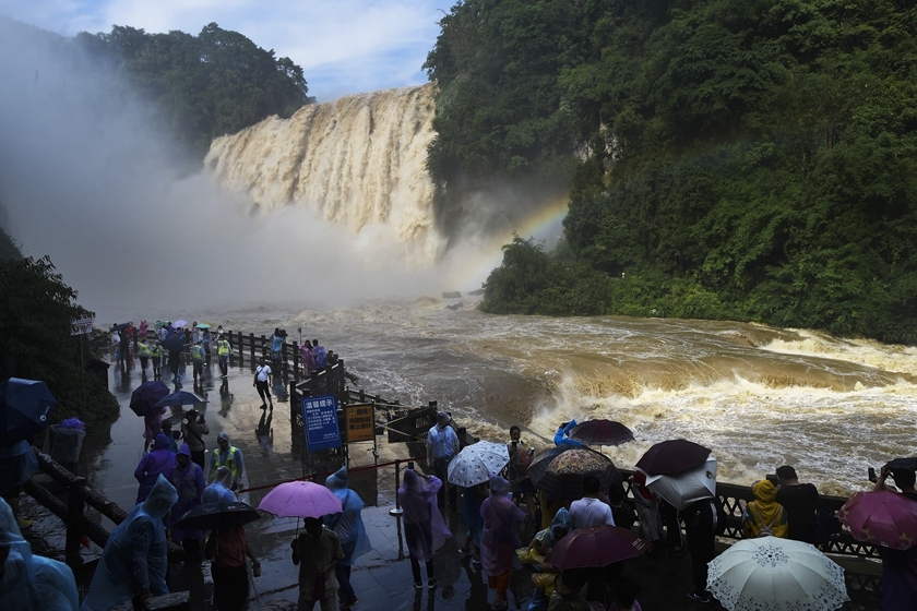 2020年6月14日,贵州安顺,游客在黄果树瀑布。
