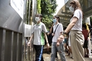 2020年7月7日,香港,清洁人员清洁学校各出入口。位于香港黄大仙的中华基督教会扶轮中学有一学生确诊,中午时分有学生陆续回校接受检测。图/人民视觉