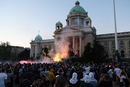 当地时间2020年7月8日,塞尔维亚贝尔格莱德,抗议者在议会大厦前示威,反对宵禁政策。据悉,当晚10点左右,一小群反对党的抗议者冲破了警方的警戒线,破门而入,闯进了议会大楼。很快,警方将抗议者赶出了大楼。抗议者还向警察投掷照明弹、石头、瓶子和鸡蛋,几辆警车被点燃。警方使用了催泪瓦斯驱散人群。