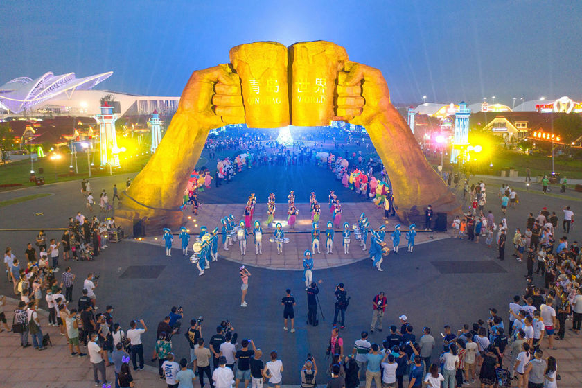 2020年8月2日,青岛西海岸新区,夜幕降临,啤酒城灯光不停变幻,给夜晚增添无限魅力。图/视觉中国