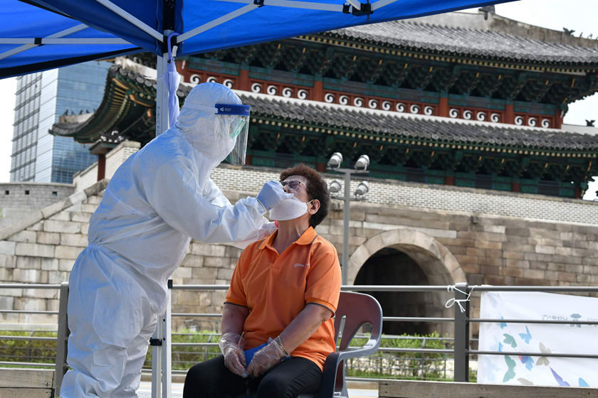 当地时间2020年8月10日,在韩国首尔南大门附近的新冠病毒临时检测站,医护人员为市民采集鼻咽拭子。韩国首尔市政府10日通报一起聚集性感染事件,9例新冠确诊病例与市中心南大门市场有关,包括8名商贩和1名家属。图/人民视觉