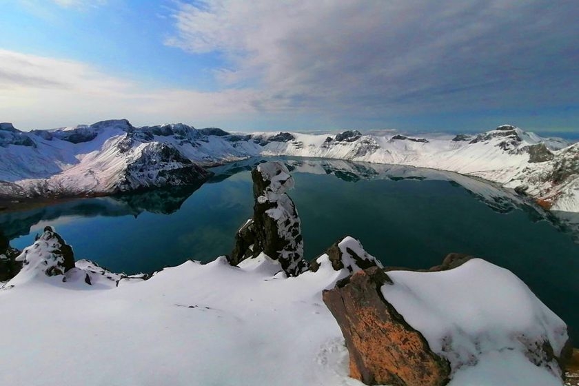 天池被银装素裹的群峰环绕,倒影在碧水之间,别有一番景色。图/IC PHOTO