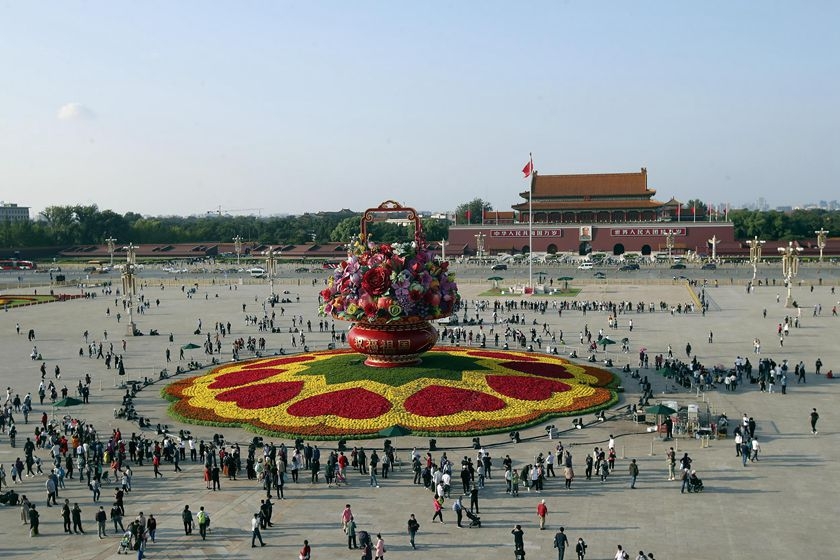 2020年9月24日,游客在天安门广场游览。“双节”小长假临近,故宫、天安门广场游人如织。当天北京秋风送爽,气温舒适宜人。天安门广场上的2020“祝福祖国”大花篮将于25日正式完工,亮相天安门广场与市民共迎佳节。图/人民视觉
