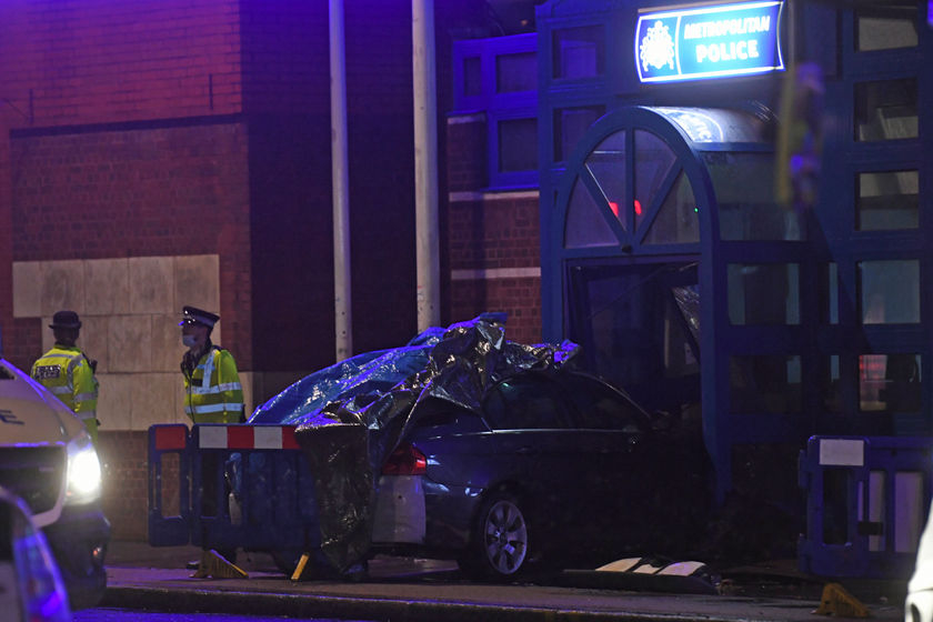当地时间2020年11月11日,英国伦敦北部埃德蒙顿的一个警察局遭一辆汽车冲撞,警方正在处理这起“事件”。这辆车已经部分嵌入了警察局的入口。目前,与事件有关的一名男子已经被警方拘留,关于此人没有更多的细节。目前,尚未有人员伤亡的消息。图/人民视觉