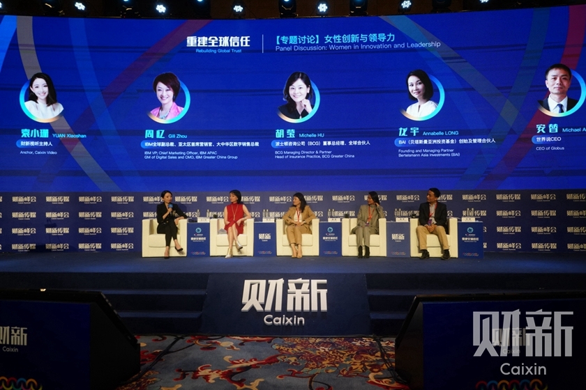 2020年11月13日,北京,第十一届财新峰会“女性创新与领导力”专题讨论现场,IBM全球副总裁、亚太区首席营销官、大中华区数字销售总裁周忆发表讲话。图/财新传媒