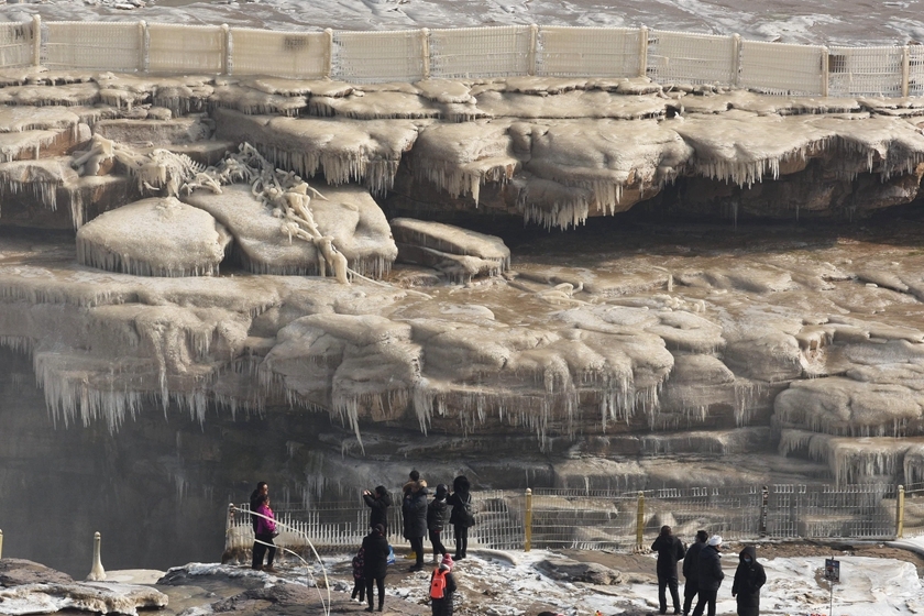 黄河壶口瀑布现流凌冰挂景观 引游客前来观赏