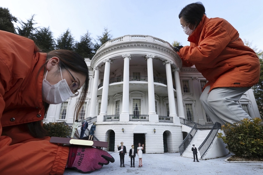 当地时间2020年12月28日,日本栃木县日光市,东武世界广场的工作人员为园内的微缩建筑“大扫除”,辞旧迎新年。图为工作人员打扫微型白宫。东武世界广场是以世界各地名胜古迹的微缩景观为特色的公园,在这个公园里,有美国白宫、埃及金字塔、日本清水寺等世界著名建筑物的迷你模型,其中,大多数按1比25的比例仿造。图/IC photo