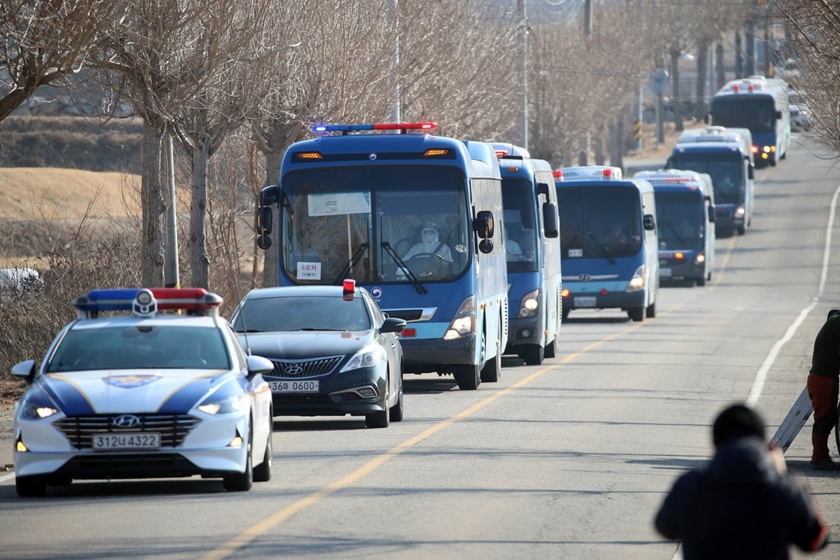 据韩媒报道,韩国法务部28日表示,首尔东部拘留所对27日第二次新冠全面检测中呈阴性的1689人进行第三次检测,共233人检测结果呈阳性。由此,该拘留所确诊病例累计达748例。12月28日上午,大批警车与公务车出动,将345名轻微或无症状新冠患者,移送至庆尚北道北部第二监狱。图/IC PHOTO