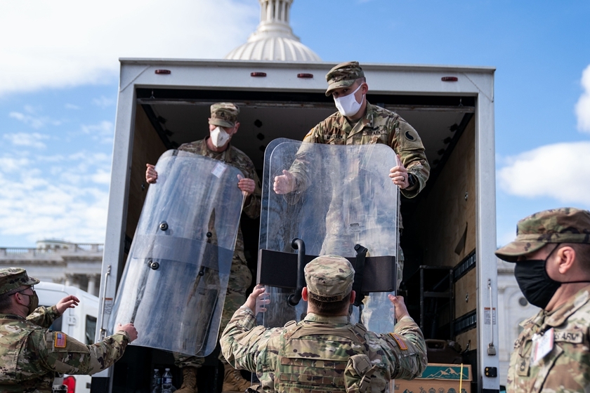 当地时间2021年1月17日,美国首都华盛顿,国民警卫队成员卸载物资。连日来,华盛顿特区的安保措施日趋严密,国民警卫队队员荷枪实弹巡逻。五角大楼日前宣布,已派遣2.5万名国民警卫队士兵协助总统就职典礼的安保工作。为了防止华盛顿出现集会抗议、进而引发冲突事件,白宫周围多条道路被提前封闭,周边商户普遍都钉上木板,通往总统就职典礼相关区域的每条道路路口都部署了国民警卫队军车,由国民警卫队成员站岗执勤。图/人民视觉