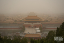 2021年3月15日,在景山俯瞰故宫,殿宇隐没在黄沙之中。这是近10年我国遭遇的强度最强的一次沙尘天气过程,沙尘暴范围也是近10年最广。 图/财新记者 蔡颖莉
