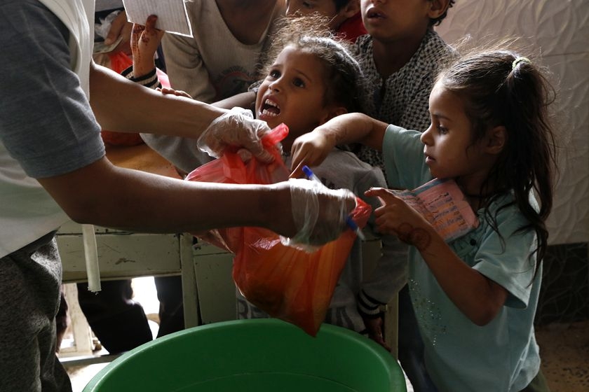 战乱疫情使也门陷入饥荒 贫困家庭排队领取餐食