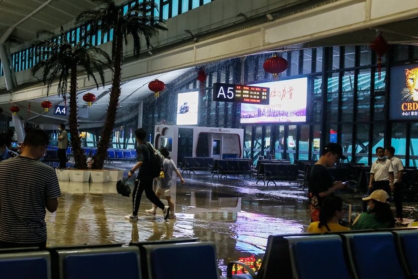 2021年5月10日,武汉遭遇暴雨,武汉站候车大厅整个屋顶出现漏水情况。目前,漏水已经得到控制。图/人民视觉