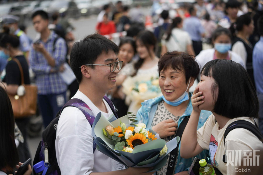 考场外,一位家长高举向日葵迎接考试结束的学子。