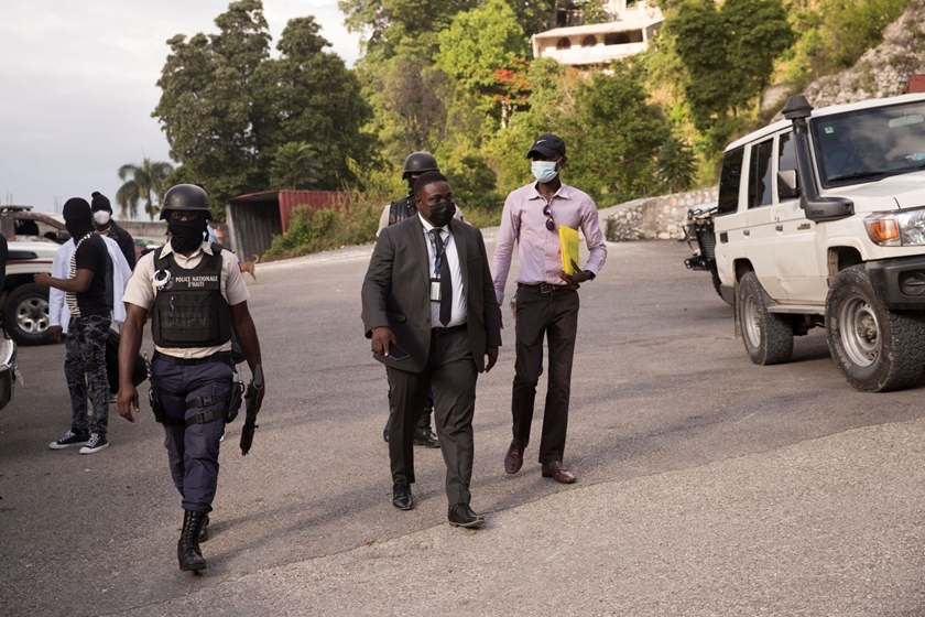 当地时间2021年7月15日,海地太子港,美国FBI参与调查海地总统莫伊兹被暗杀一事,查看现场搜集证据。图为海地警察协助FBI进行调查。图/IC PHOTO