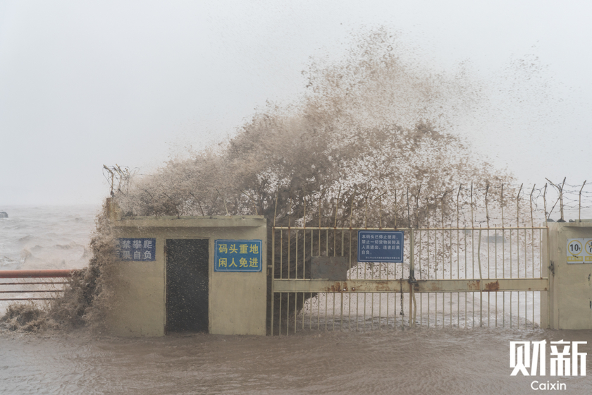 7月25日上午7时许,浙江省舟山市普陀区,海滨公园外海水倒灌导致步道被淹没,大风掀起超过十米的狂涛。中央气象台7月25日10时继续发布台风橙色预警。预计,“烟花”将以每小时15公里左右的速度向西北方向移动,今天下午擦过或登陆浙江舟山,穿过杭州湾,今天晚上在浙江嘉兴到江苏启东一带沿海登陆(台风级,12级,33-35米/秒)。登陆后强度逐渐减弱,并将向偏西转偏北方向移动。图/财新记者 粱莹菲