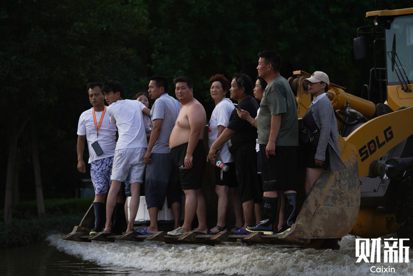 7月25日下午,河南省新乡市新中大道北与中原东路路口,受灾群众靠铲车转移到安全地带。截至24日,新乡市暴雨已造成全市11个县区116个乡镇受灾,受灾人口171万余人,约占全市人口的1/4。图/财新记者 丁刚