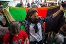 当地时间2021年8月23日,印度新德里,参加抗议活动的一名抗议者挥舞阿富汗国旗。当天,数百名阿富汗难民聚集在联合国难民署驻新德里办事处外,要求承认他们的难民身份,否则会持续抗议,甚至绝食。图/IC photo